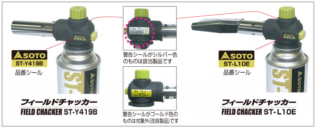平素は弊社製品をご愛用いただき、厚く御礼申し上げます。この度、2008年3月より新製品として販売させていただきましたフィールドチャッカー2機種におきまして、火口部分が脱落する可能性があることが判明いたしました。 燃焼中に火口部分が脱落した場合、炎は脱落と同時に消火し、ご使用できなくなります。(但しガス漏れ等ではありませんので事故につながる可能性は極めて低いと思われます。)製品の使用中止をお願いするとともに該当製品の回収・交換を行わせていただきますので、何とぞご理解ご協力の程よろしくお願いいたします。